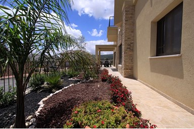 בחצר הוילה מדשאה גדולה, גינה פורחת, פינת ישיבה משפחתית, מתקני משחק לילדים ונוף עוצר נשימה.