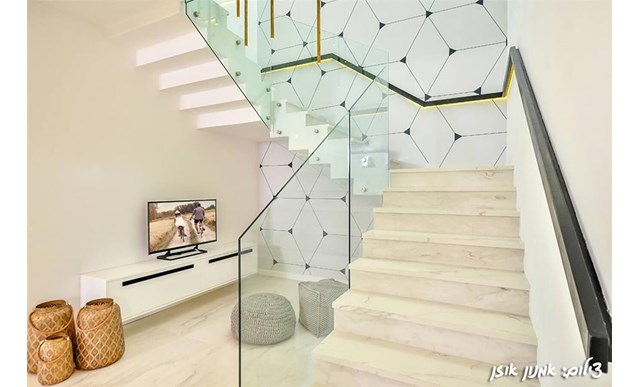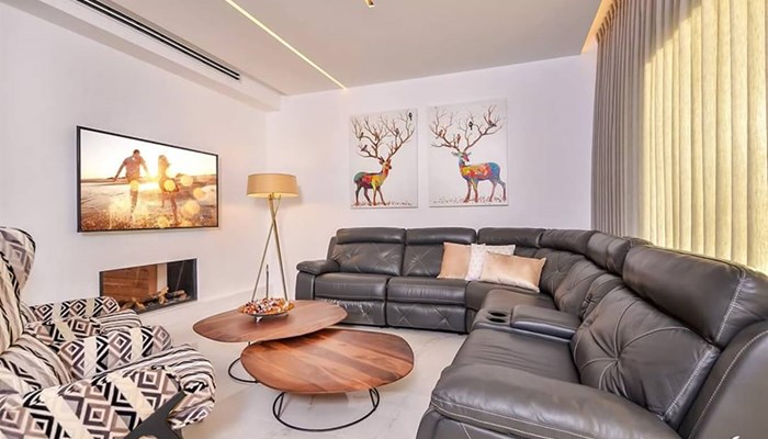 - סלון מרווח וגדול בו קמין גז לאווירה חמה וביתית, מסך טלוויזיה ענק בחיבור לאנדרואיד, מערכת ישיבה איכותית העשויה מעור.